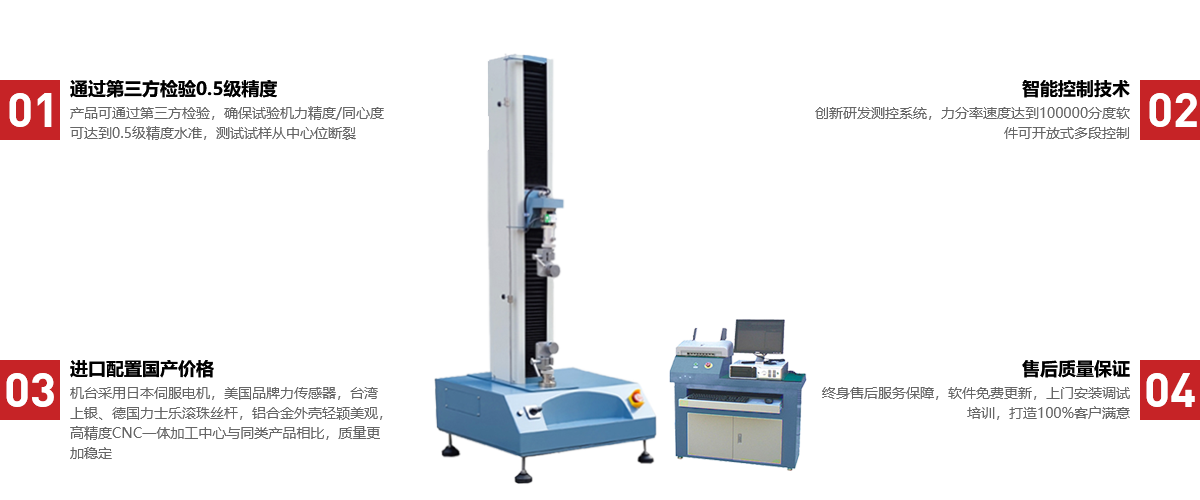 該系列產(chǎn)品采用全電腦控制,板載USB2.0介面,多語言切換,精度高,易于操作,可滿足多國標準,廣泛應用于橡膠、塑膠、電線電纜、紡織物、防水材料、 無紡布等非金屬材料及金屬絲、金屬箔、金屬板材、金屬棒等材料的力學性能測試、分析與研究,搭配不同夾具可完成各種材料的拉伸、壓縮、彎曲、剪切、撕裂、剝離等多種測試試驗項目。