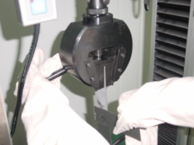 2.安裝樣品:將樣品放置在拉伸試驗(yàn)機(jī)的工作臺(tái)上,確保夾具與樣品適配, 并按規(guī)定的操作將樣品夾在試驗(yàn)機(jī)夾具上。