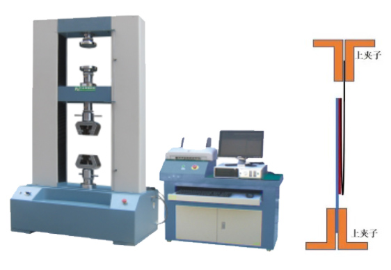 如圖所示,拉力機上有上下兩個夾子,將已粘貼固定極片的鋼板插入下夾內(nèi),垂直固定;將未貼膠的極片插入上夾內(nèi)固定,使貼合在膠紙上的極片與上夾固定的極片成180°(或90°)。固定好測試樣品后,首先校準清零,設定測試寬度,極片剝離長度50-150mm,剝離速50-100mm/min,然后開始測試,即可得到剝離強度曲線及平均值。處理數(shù)據(jù)時,將測試開始和結(jié)束時兩段刪除,即可得到標準曲線。
