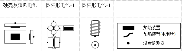 使用平面狀或者棒狀加熱裝置,并且其表面應(yīng)覆蓋陶瓷、金屬或絕緣層。對于尺寸與鋰離子電池單體相同的塊狀加熱裝置,可用該加熱裝置代替其中一個鋰離子電池單體,與觸發(fā)對象的表面直接接觸;對于薄膜加熱裝置,則應(yīng)將其始終附著在觸發(fā)對象的表面;加熱裝置的加熱面積都應(yīng)不大于鋰離子電池單體的表面積;將加熱裝置的加熱面與電池單體表面直接接觸,加熱裝置的位置應(yīng)與溫度傳感器的位置相對應(yīng);安裝完成后,立即啟動加熱裝置,以加熱裝置的最大功率對觸發(fā)對象進(jìn)行加熱;加熱裝置的功率要求參見下表;當(dāng)發(fā)生熱失控或者定義的監(jiān)測點溫度達(dá)到300℃時,停止觸發(fā)。