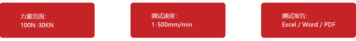 膠帶90°/180°剝離強度測試;橡膠、塑膠拉伸測試;塑膠彎曲測試。金屬絲、薄板拉伸、彎曲測試;織物撕裂測試;飲料包裝壓縮、頂破力測試。
